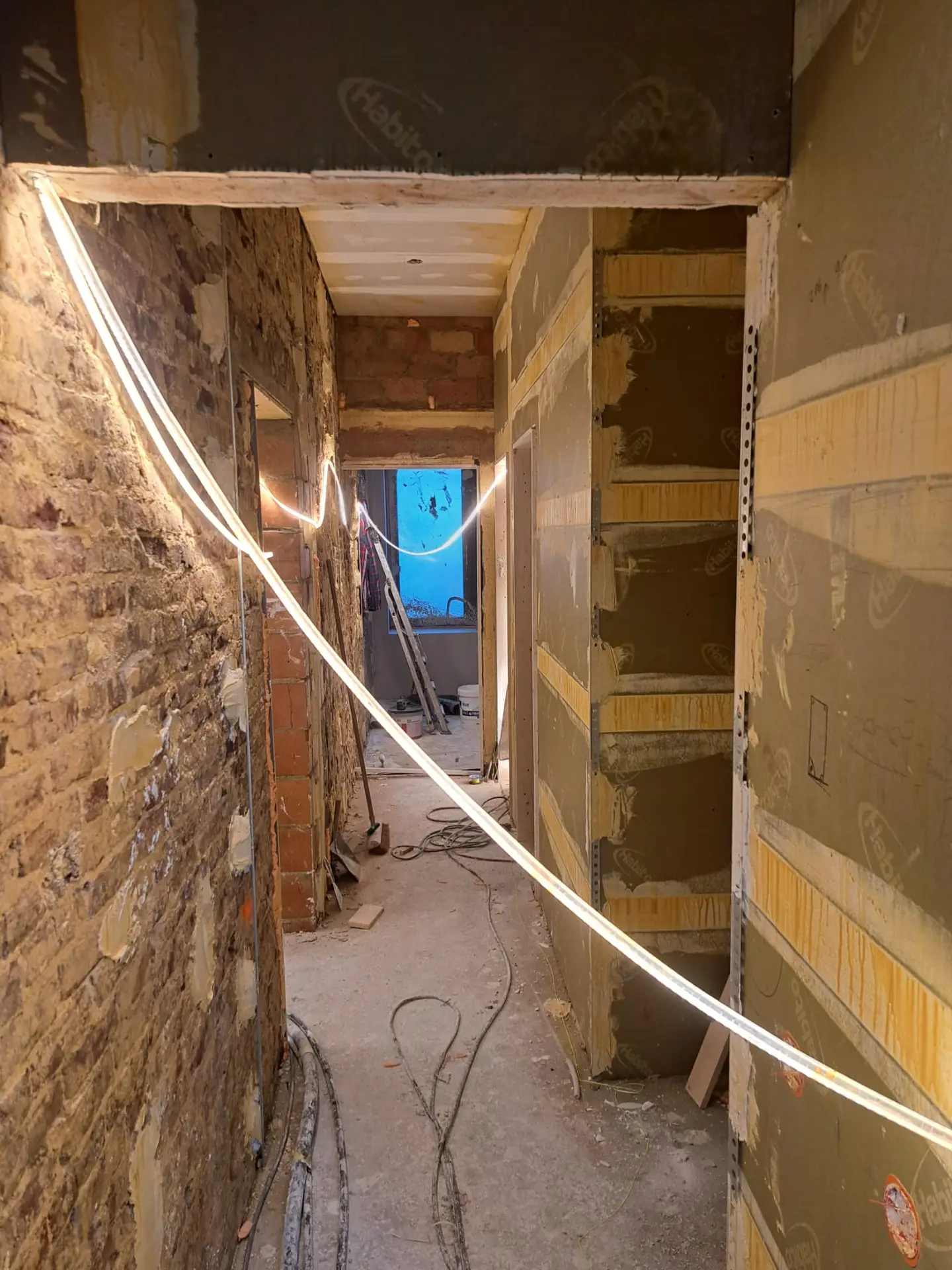 Renovaties van interieurruimtes, inclusief kamers, plafonds en vloeren. Installatie van binnenarmaturen, afwerkingen en inrichtingen. Schilder-, pleister- en interieurdecoratie-diensten.